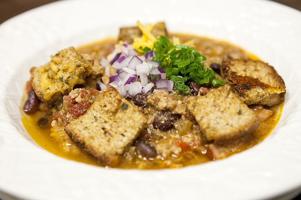 We paired our chili with a homemade whole-grain cheddar crouton, which is also a very easy recipe to put together, that goes wonderfully with the chili. Obviously if there is another bread that you prefer, such as cornbread, feel free to substitute or mix and match.