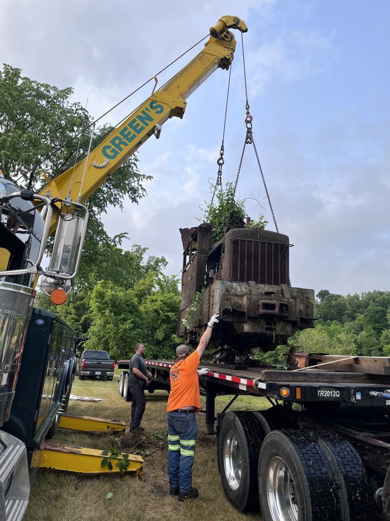 Early Friday morning, Green鈥檚 Road and Towing Services of Burgettstown arrived at the center of the farm with its massive rotator crane and flatbed truck. The rotator efficiently lifted the rusted, weed-infested cars and placed them on the flatbed for transport to central Ohio.