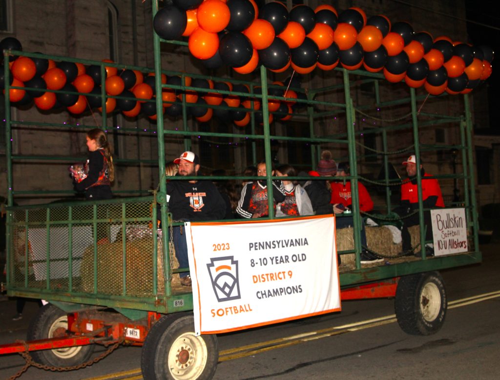 Members of the 2023 Pennsylvania District 9 champion Bullskin softball team toss candy as the float moves along the route in the 115th annual Halloween Parade Tuesday night in Connellsville.