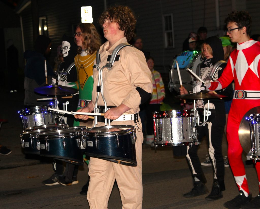 Connellsville band’s percussion section marches in city’s annual Halloween parade, sponsored by the New Haven Hose Company.