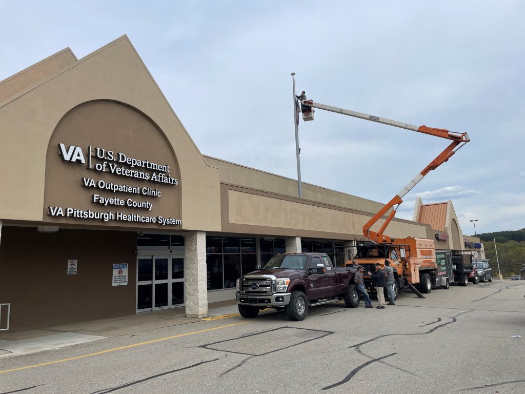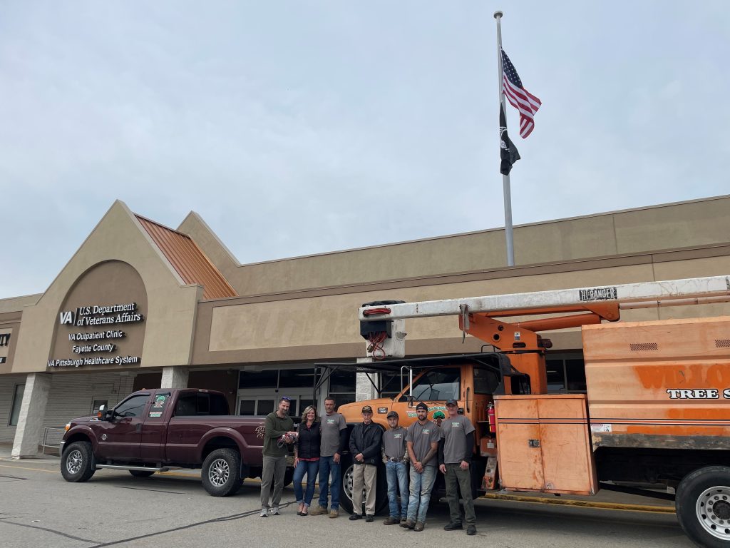 Myers Tree Service in Fairchance recently volunteered their services, time and equipment to hang flags at the Fayette County VA Outpatient Clinic in Uniontown.