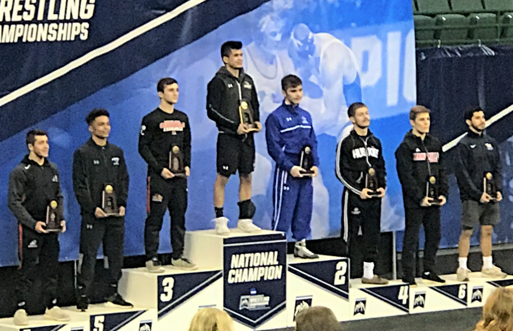 Howard was joined on the medal stand by four UPJ teammates, including Chris Eddins, who won his second straight national championship with a 7-2 victory over Tiffin鈥檚 Trey Grine in the finals at 149. Eddins, the No. 1 seed who won the title at 141 last season, pinned Belmont Abbey鈥檚 John Gahagan in 2:41 in the first round. He edged Lindenwood鈥檚 Gavin Londorff, 3-1, in the quarterfinals before a 7-4 decision over McKendree鈥檚 Isaiah Kemper in the semifinals.