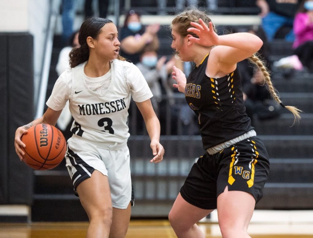West Greene’s Anna Durbin looks to make a move around Monessen’s Sidney Campbell during Monday night’s game at Monessen.