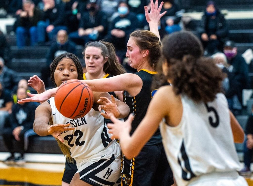 Monessen’s Avanti Stitch makes a pass around West Greene’s Kasie Meek to Hailey Johnson during Monday night’s game at Monessen.
