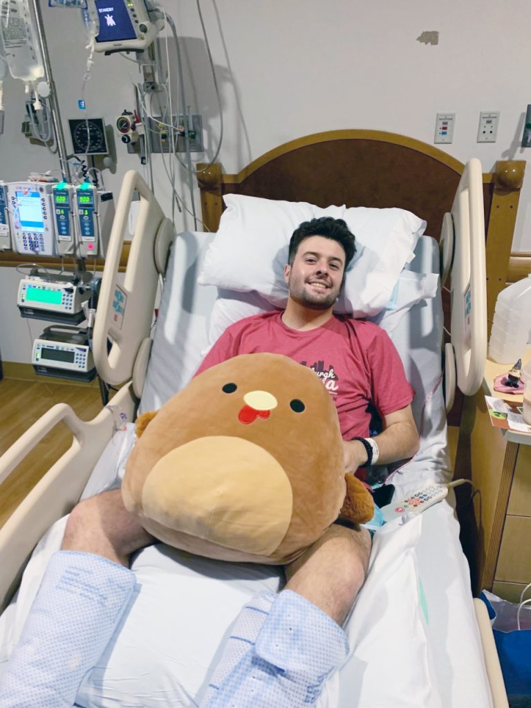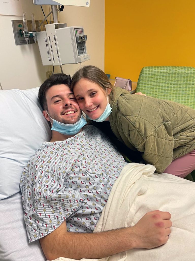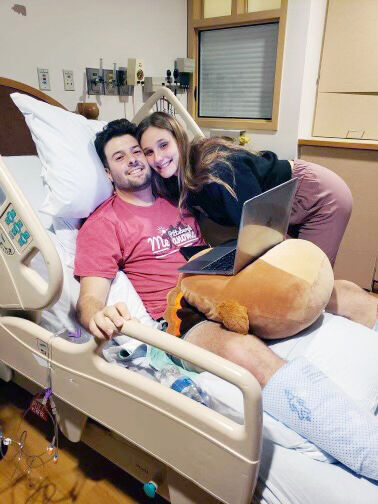 Corey Fischer, a Waynesburg University senior marketing major and baseball player, is pictured with his girlfriend, Haley Frizzell, at UPMC Children鈥檚 Hospital of Pittsburgh during inpatient chemotherapy treatment for Ewing sarcoma. Fischer, who was diagnosed in November 2021, was gifted tickets to Super Bowl LVI in Los Angeles on Sunday.