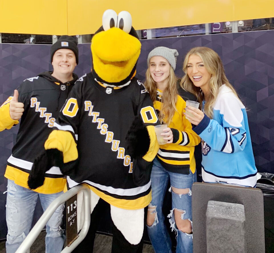 Corey Fischer, an avid Pittsburgh sports fan, left, is pictured with the Penguins mascot, along with his girlfriend, Haley Frizzell, and neighbor Courtney Conway. Recently, Pittsburgh Steeler linebacker T.J. Watt presented Fischer with Super Bowl tickets while Fischer was undergoing in-patient chemotherapy at UPMC Children鈥檚 Hospital of Pittsburgh.