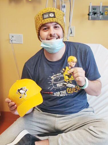 Waynesburg University senior Corey Fischer, a pitcher for the Yellow Jackets baseball team, shows some of the Pittsburgh Penguins memorabilia he received at UPMC Children鈥檚 Hospital of Pittsburgh, where he is an oncology patient undergoing chemotherapy treatment for Ewing sarcoma. Fischer FaceTimed with Penguins Sidney Crosby and Jason Zucker.