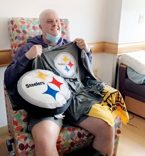 Corey Fischer, left, and his girlfriend, Haley Frizzell, at UPMC Children鈥檚 Hospital of Pittsburgh, where he is undergoing treatment for cancer. Fischer will be attending Super Bowl LVI in Los Angeles, courtesy of T.J. Watt and the Pittsburgh Steelers.