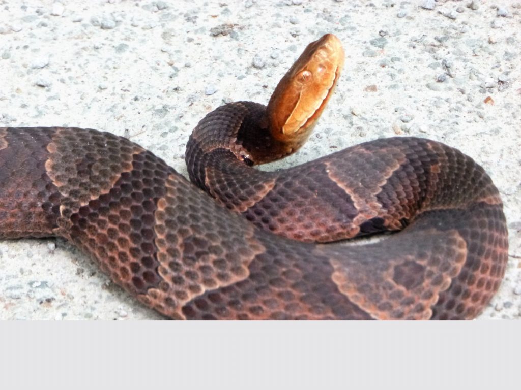 A copperhead in our region will be a generally brown to coppery color. Dark bands run across the body, interspersed with regions of lighter shade. The one most reliable mark that identifies a copperhead are those darker bands. On a copperhead, the bands will be most narrow where they cross the top of the snake’s back, becoming wider toward its belly. Another way to consider this is that the dark identifying bands form an “hourglass” pattern, with the narrow “waist” at the top of the back, directly over the spine.