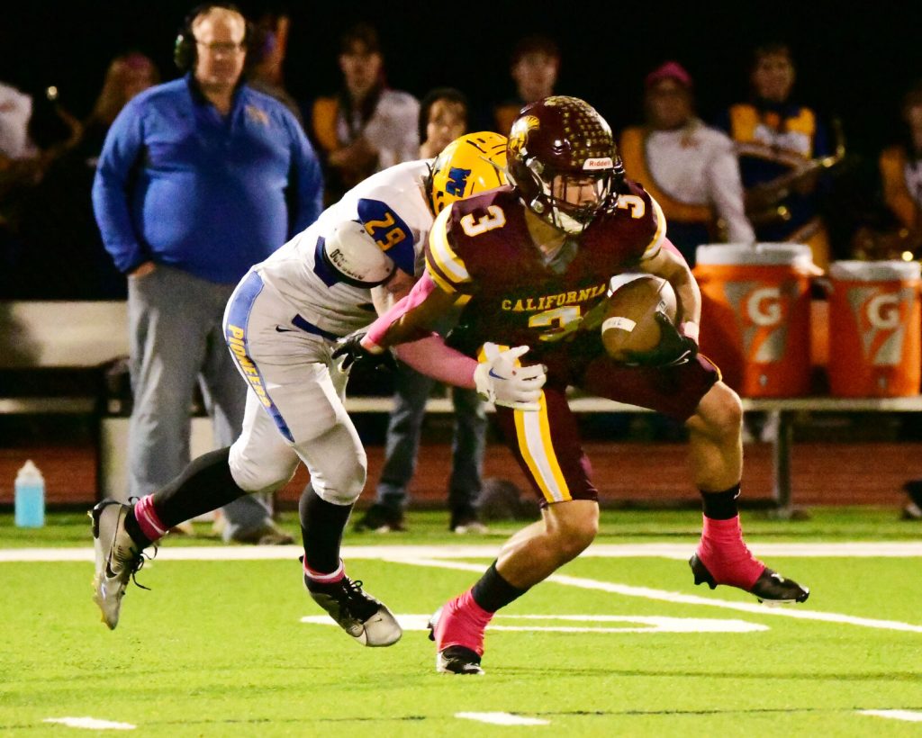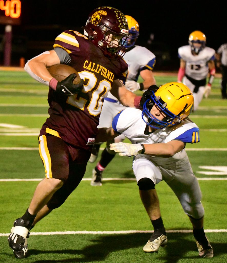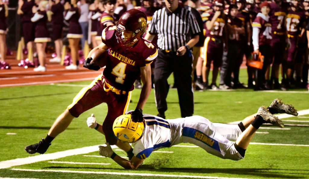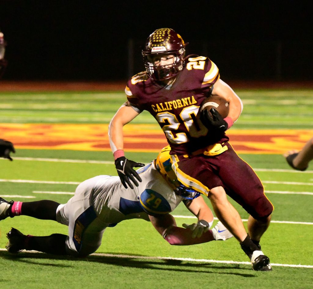 California quarterback Jake Layhue scored three touchdowns and accounted for the extra points. Spencer Petrucci rushed for two touchdowns and 131 yards.