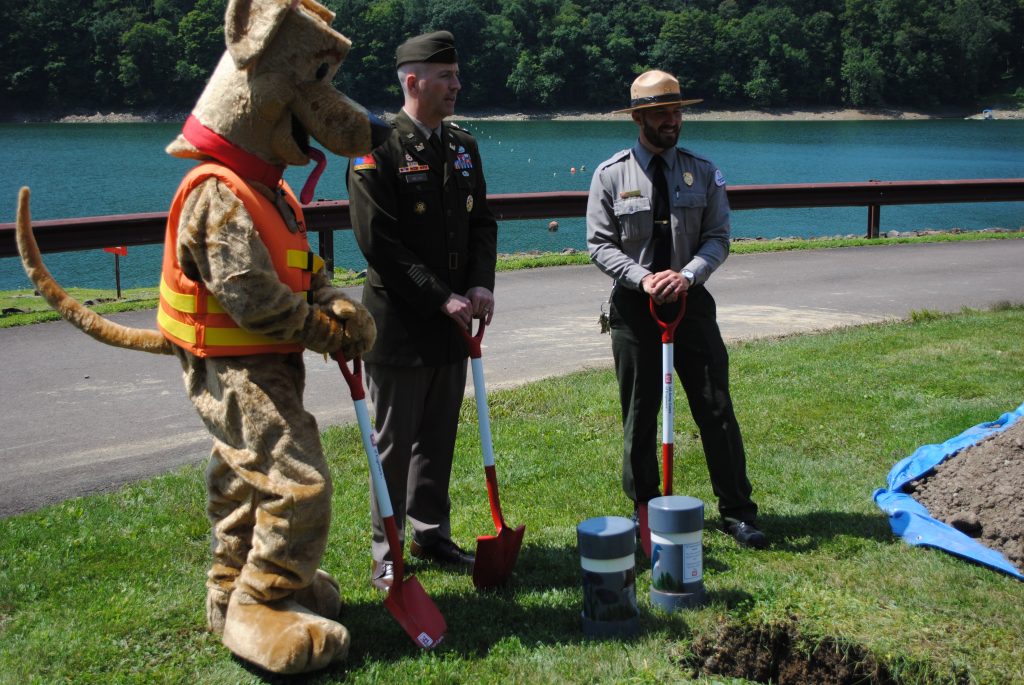 Colonel Melin, Youghiogheny River Lake resources manager Vincent Klinkner, and U.S. Army Corps’ water safety dog Bobber planted an eastern redbud tree to commemorate the occasion and buried two time capsules to be opened in 2048, at Yough Lake’s centennial anniversary. The capsules contained personal messages to the future from attendees.