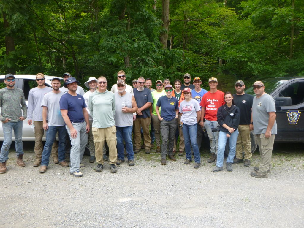 Volunteers from EQT Corporation in Canonsburg and the Chestnut Ridge Chapter of Trout Unlimited supplied the labor to treat hemlock trees along a portion of Dunbar Creek on State Game Land No. 51 near Dunbar. Game Commission land management personnel, who are licensed pesticide applicators, trained and accompanied the teams of volunteers as required by law.