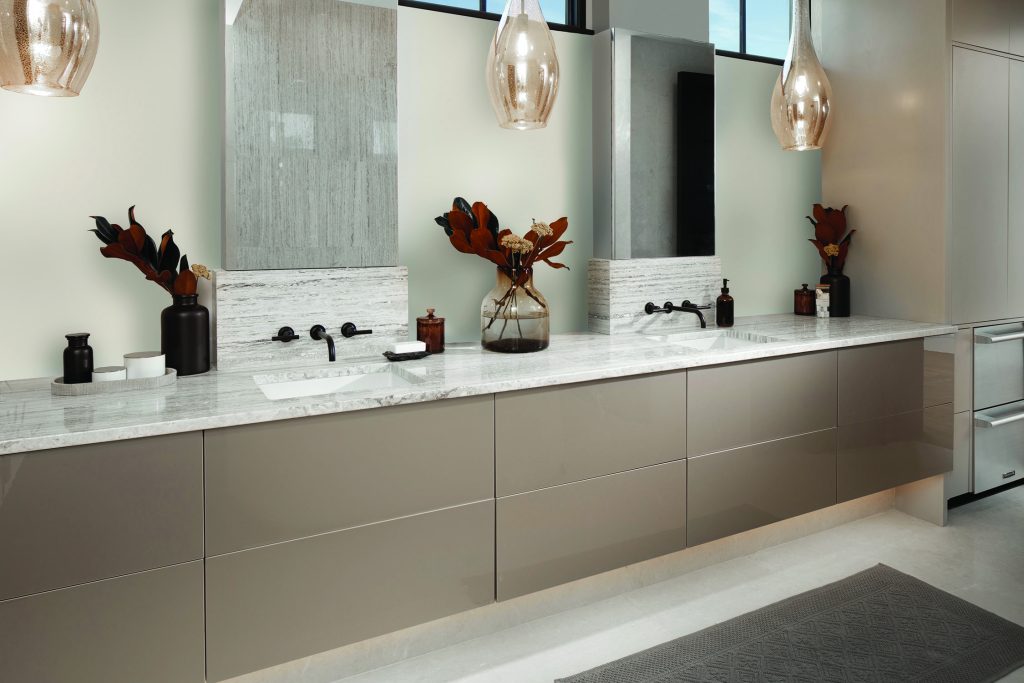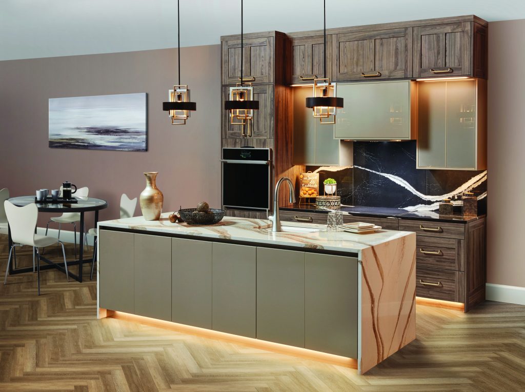 Collectively, cabinets are the biggest component of most kitchens. Since kitchens tend to be the hub of the home, it’s important to maintain a homey feel while adding the luxury of modern features. Using warm colors, gold-toned hardware and sleek door styles can deliver a glamorous yet welcoming design.
