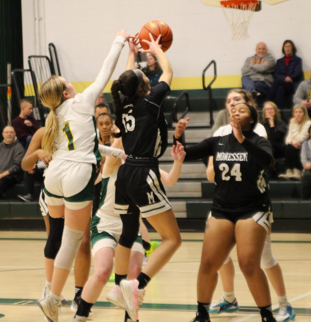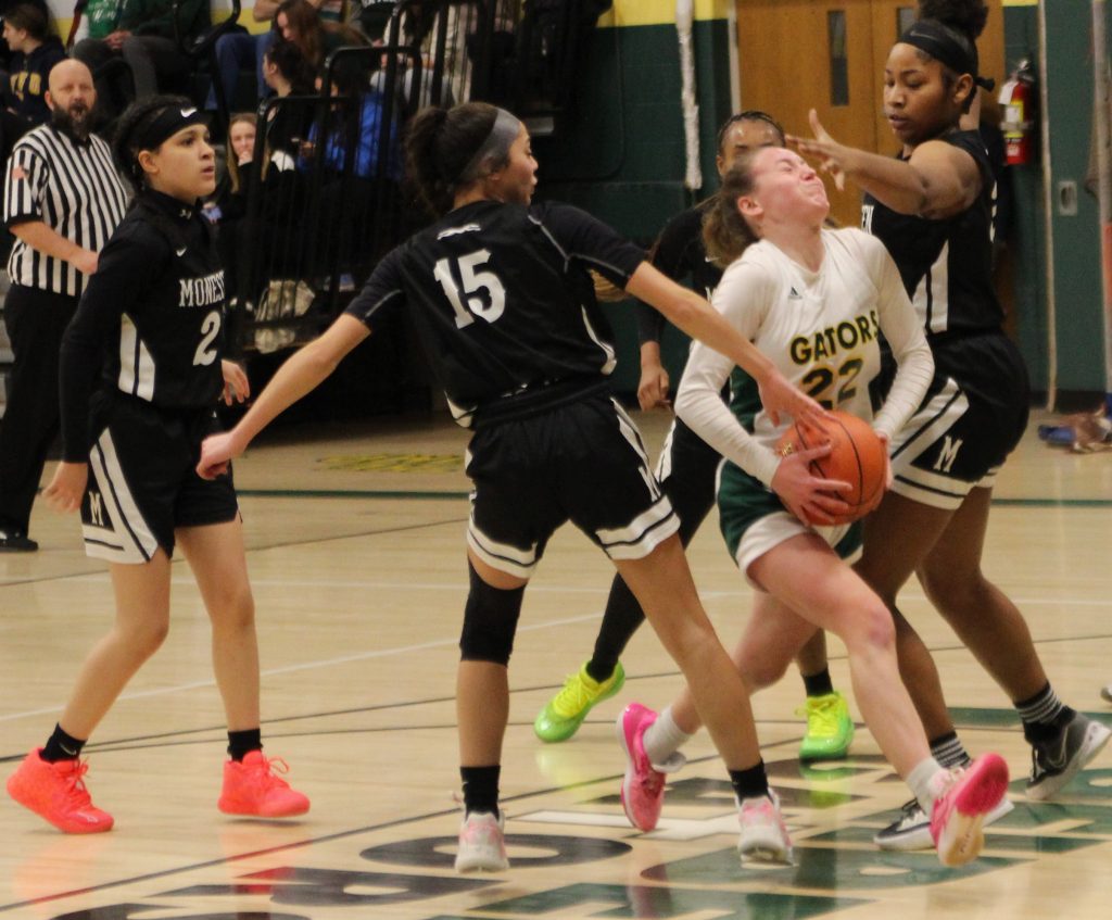 Monessen was able to hold the Lady Gators鈥 Emma Larkin to 10 points in the first half and didn鈥檛 allow other Geibel players to make up the slack by playing an extended 3-2 zone defense.