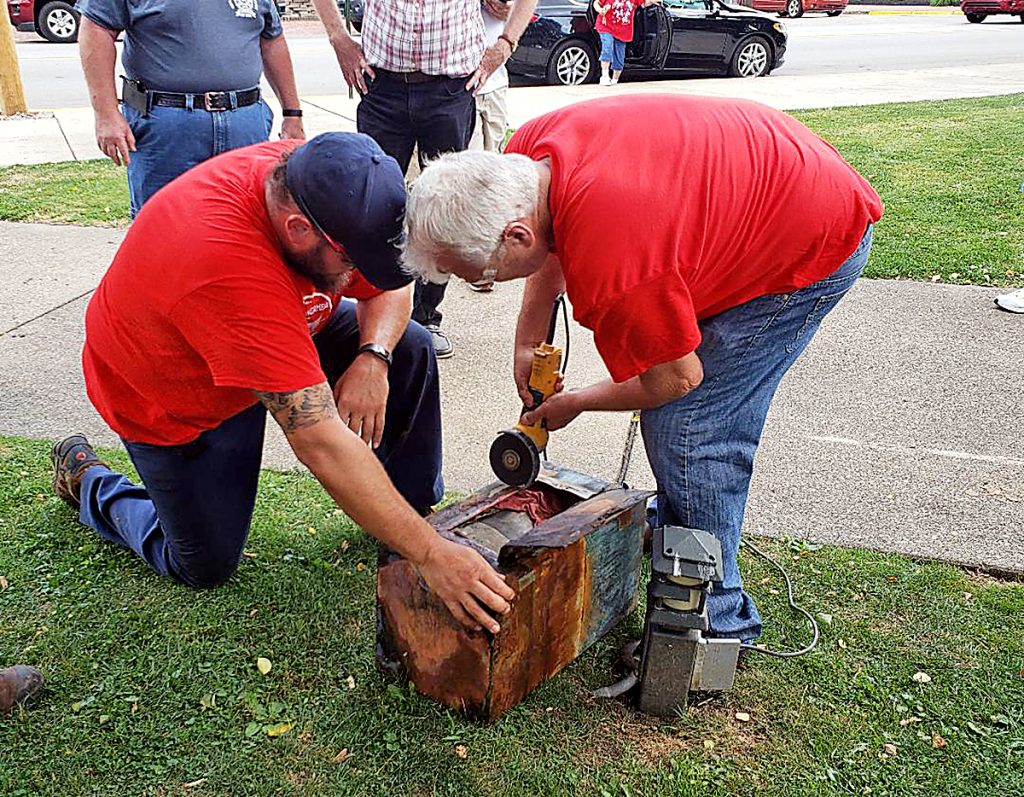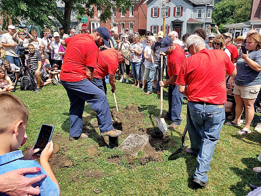 It took four Monongahela street department workers using shovels, heavy equipment and a grinder to free the capsule in front of a large, eager crowd.