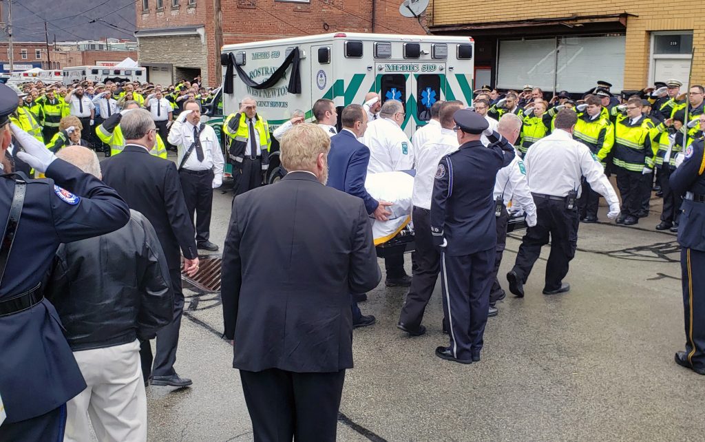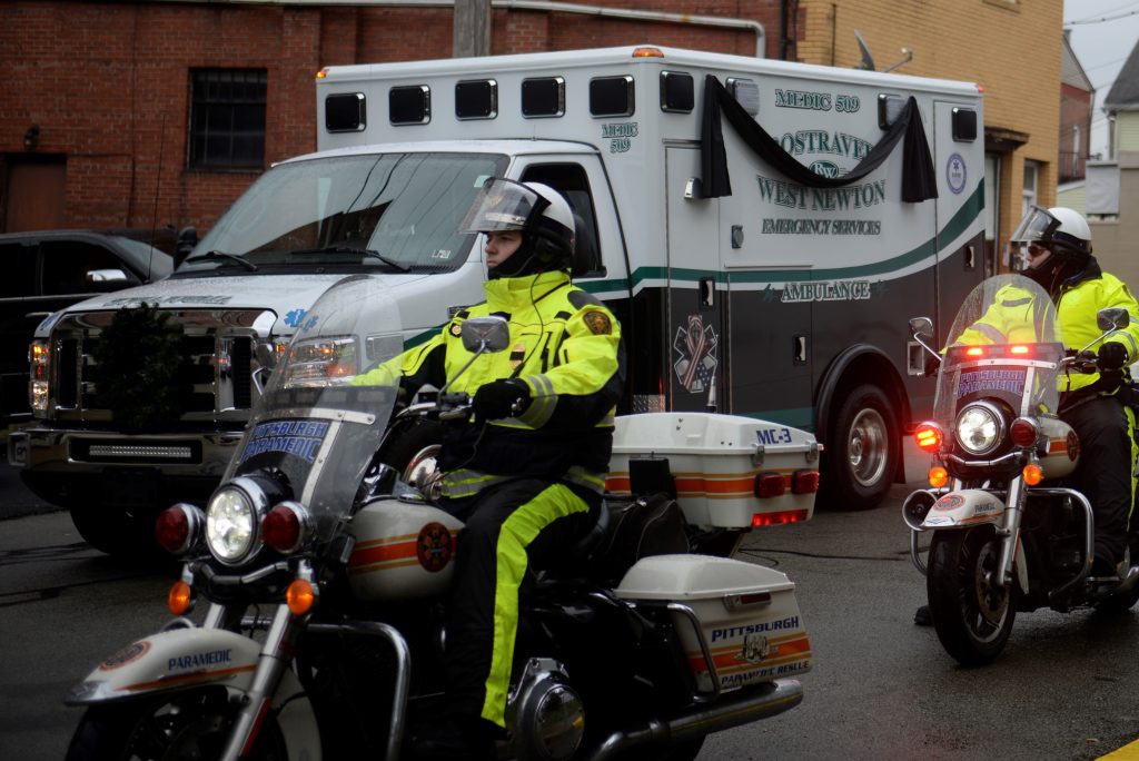 Smelser鈥檚 casket was escorted to Rostraver West Newton Medic 509 by an honor guard to bagpipe music. His ambulance was draped with black bunting. Police, firefighters, EMS and others saluted as his casket was placed into Medic 509.
