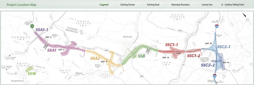 The first section, known as 55A1, is the first three miles moving east from Route 22 and connects to Route 980. He said the major construction in that area is completed with some finishing touches, such as guardrails, still remaining.