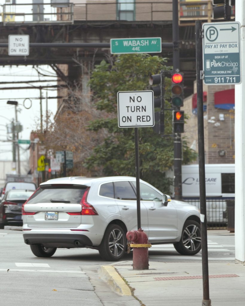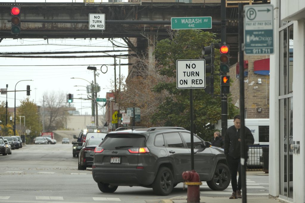 A passenger vehicle makes a right turn on red at an intersection that prohibits the turn Tuesday, Oct. 31, 2023, in Chicago.A dramatic rise in accidents killing or injuring pedestrians and bicyclists has led to a myriad of policy and infrastructure changes, but moves to ban right on red have drawn some of the most intense sentiments on both sides.