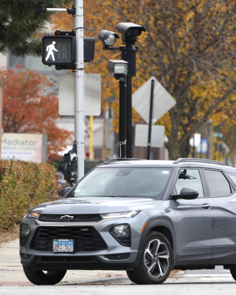 A passenger vehicle pulls up to an intersection that incorporates a red light camera Tuesday, Oct. 31, 2023, in Chicago. A dramatic rise in accidents killing or injuring pedestrians and bicyclists has led to a myriad of policy and infrastructure changes, but moves to ban right on red have drawn some of the most intense sentiments on both sides.