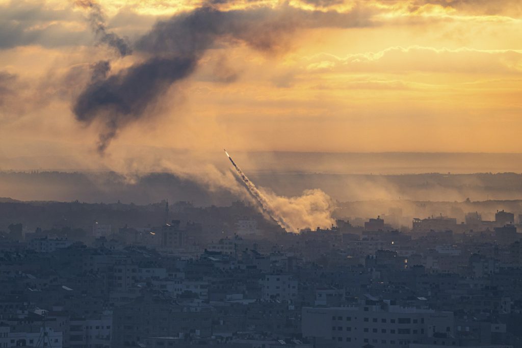 Rockets are fired from the Gaza Strip toward Israel over destroyed buildings following Israeli airstrikes on Gaza City, central Gaza Strip, Thursday, Oct. 19, 2023.