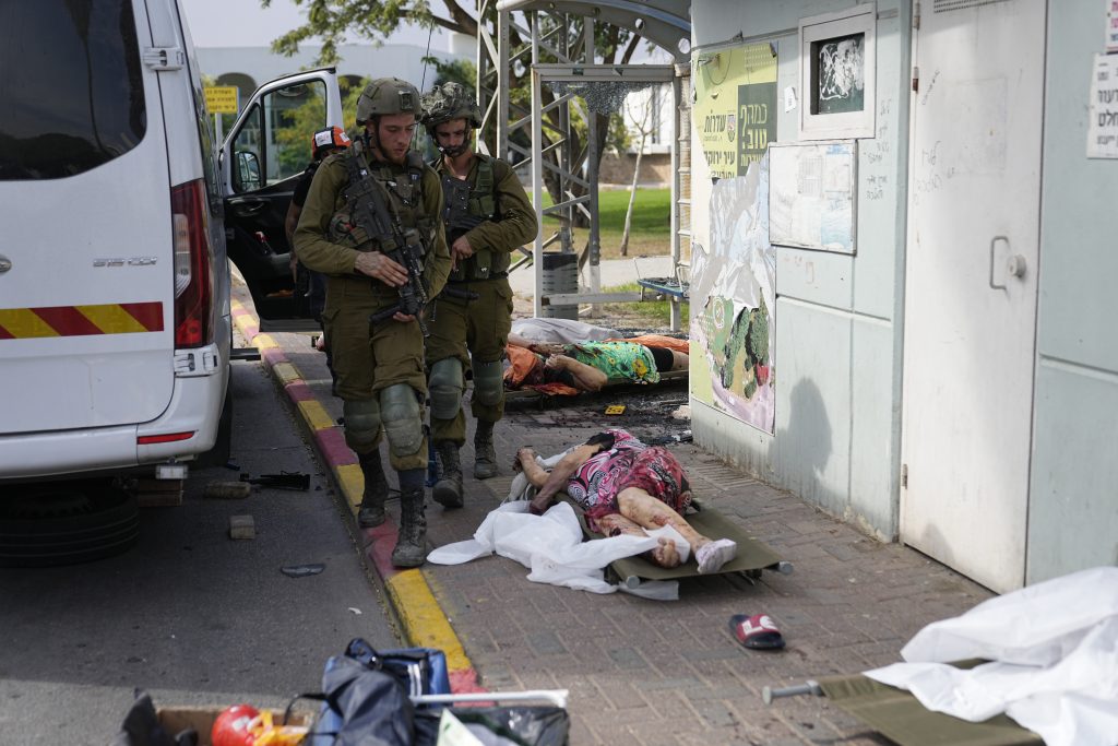 Israeli soldiers walk by civilians killed by Hamas militants in Sderot, Israel, on Saturday, Oct. 7, 2023. Hamas militants in the Gaza Strip infiltrated Saturday into southern Israel and fired thousands of rockets into the country while Israel began striking targets in Gaza in response.