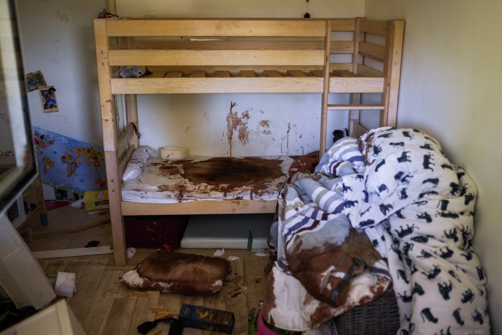 Blood is seen splattered in a child's room following a massive Hamas militant attack in Kibbutz Nir Oz, Israel, Thursday, Oct. 19, 2023. Nir Oz is one of more than 20 towns and villages in southern Israel that were ambushed in the sweeping assault by Hamas on Oct. 7. The kibbutz on a low rise overlooking the border fence with Gaza suffered a particularly harsh toll with about 100 of Nir Oz's 400 people dead or missing.