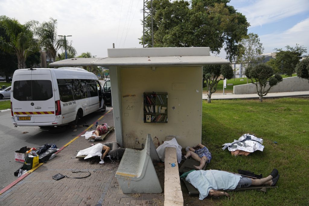 Israelis take cover from the incoming rocket fire from the Gaza Strip in Ashkelon, southern Israel, Wednesday, Oct. 11, 2023.