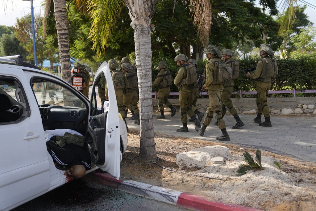 Israeli soldiers walk by a civilian killed by Hamas militants in Sderot, Israel, on Saturday, Oct. 7, 2023. Hamas militants in the Gaza Strip infiltrated Saturday into southern Israel and fired thousands of rockets into the country while Israel began striking targets in Gaza in response.