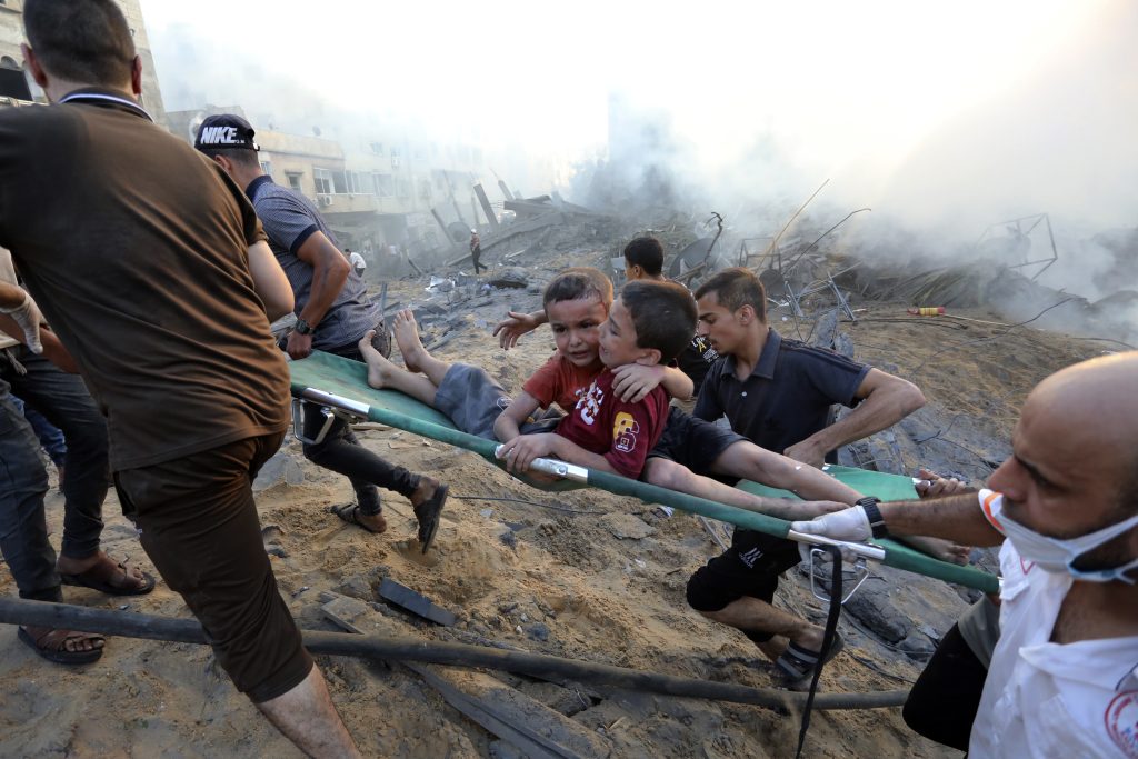 Palestinians evacuate two wounded boys out of the destruction following Israeli airstrikes on Gaza City, Wednesday, Oct. 25, 2023.