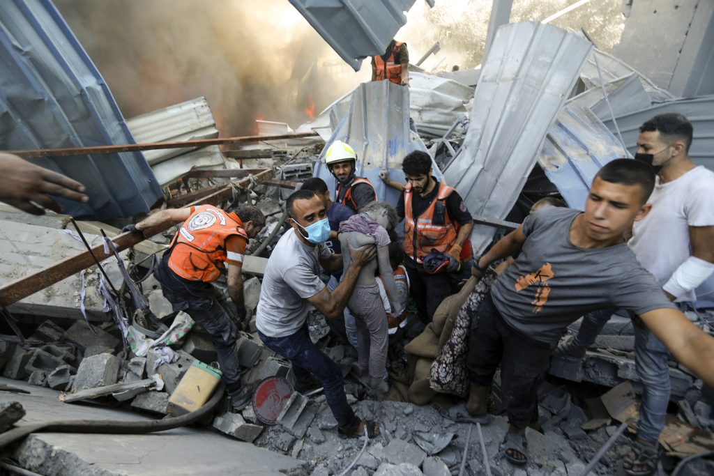 A Palestinian girl reacts as a child is carried from the rubble of a building after an airstrike in Khan Younis, Gaza Strip, Saturday, Oct. 21, 2023.