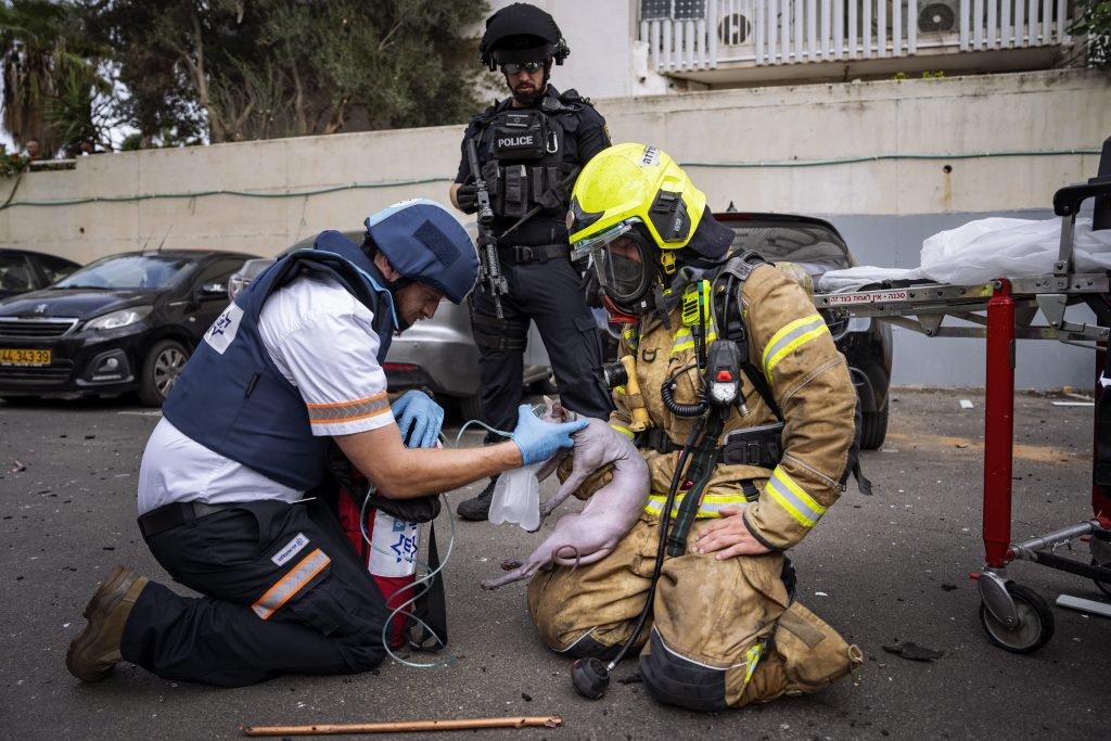 A firefighter and a paramedic deliver oxygen to an injured cat rescued from a building struck by a rocket fired from Gaza, in Tel Aviv, Israel, Friday, Oct. 27, 2023.