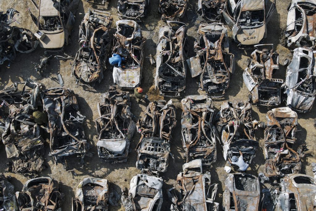 Israeli security forces inspect charred vehicles burned in the bloody Oct. 7 cross-border attack by Hamas militants outside the town of Netivot, southern Israel. The cars were collected and placed in an area near the Gaza border after the attack, in which 1,400 people were killed and some 240 people were taken hostage.