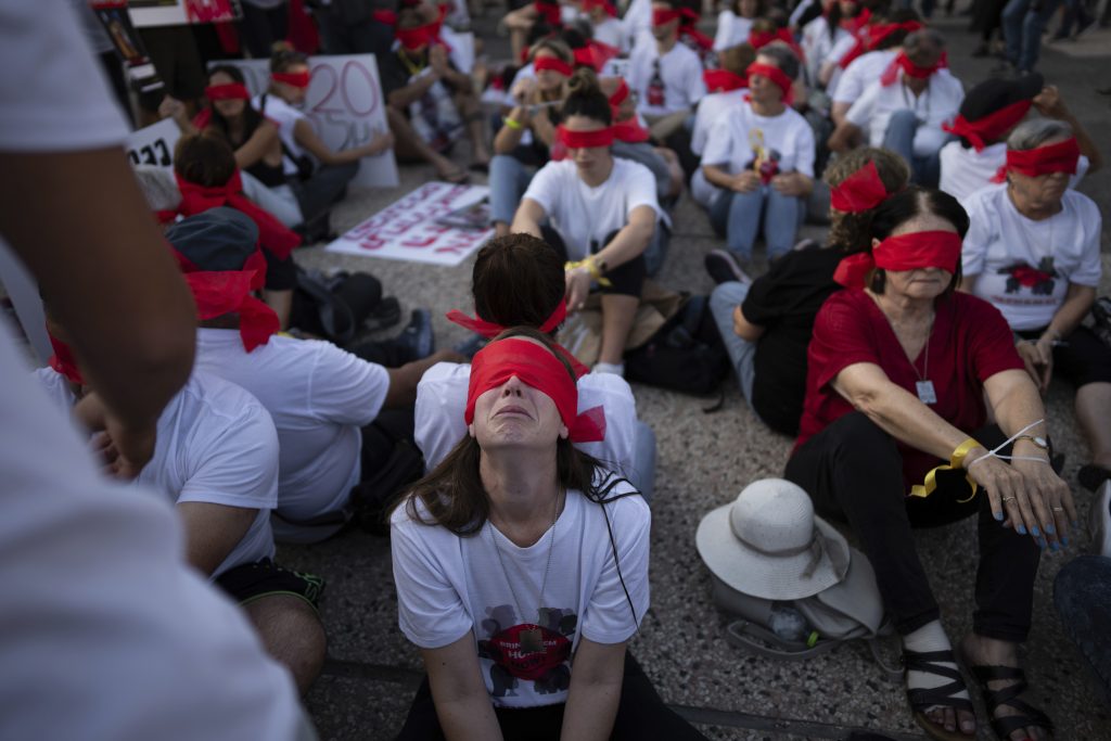 Residents of Kibbutz Kfar Azza bind their hands and wear blindfolds during a rally in solidarity with friends and relatives held hostage in the Gaza Strip, in Tel Aviv, Israel, Thursday, Nov. 2, 2023. Hamas militants overran the small farming community during a bloody cross-border raid from Gaza on Oct. 7. Eighteen residents were kidnapped and taken to Gaza, among them seven children, the youngest three years old.