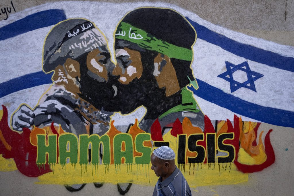 A man walks past a newly painted graffiti that reads Hamas equal ISIS, in Tel Aviv, Israel, Monday, Oct. 30, 2023. On Oct. 7, more than 1,400 people, primarily Israeli civilians, were killed and some 230 captured in an unprecedented, cross-border attack by Hamas militants from the Gaza Strip.