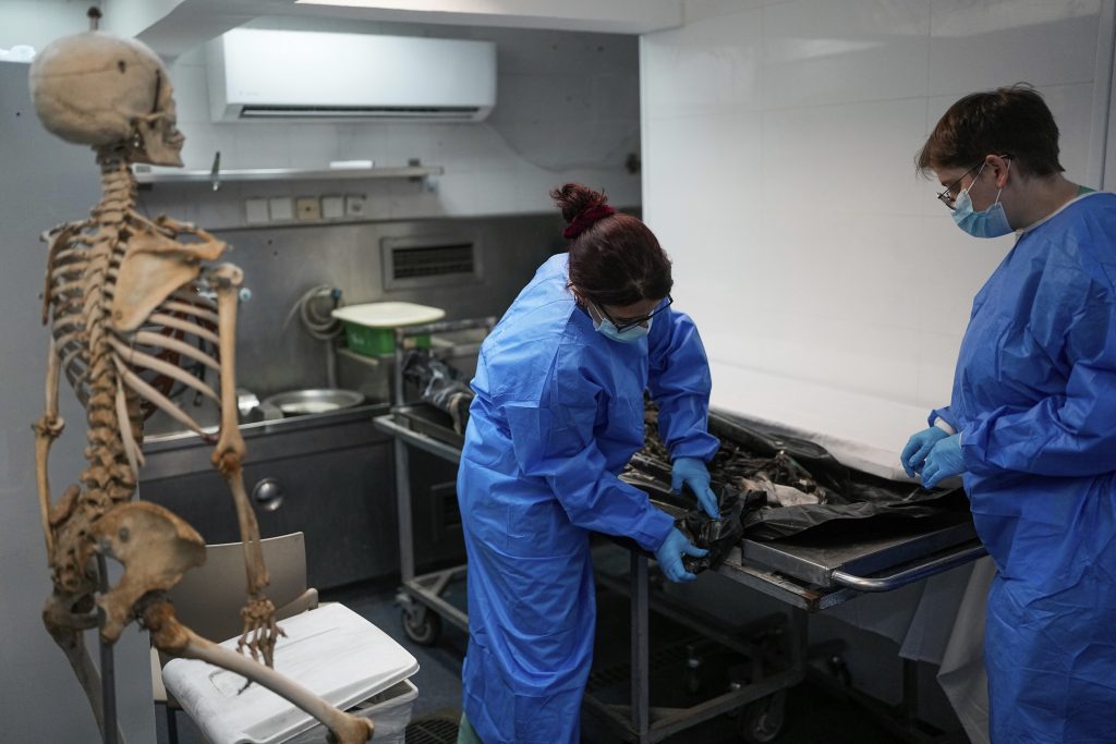 Israeli forensic experts work on bodies of Israelis killed by Hamas militants in the National Center for Forensic Medicine in Tel Aviv, Israel, Wednesday, Oct. 18, 2023. On Oct. 7, the militant Hamas rulers of the Gaza Strip carried out an unprecedented, multi-front attack on Israel. More than 1,400 people were killed and some 200 captured.