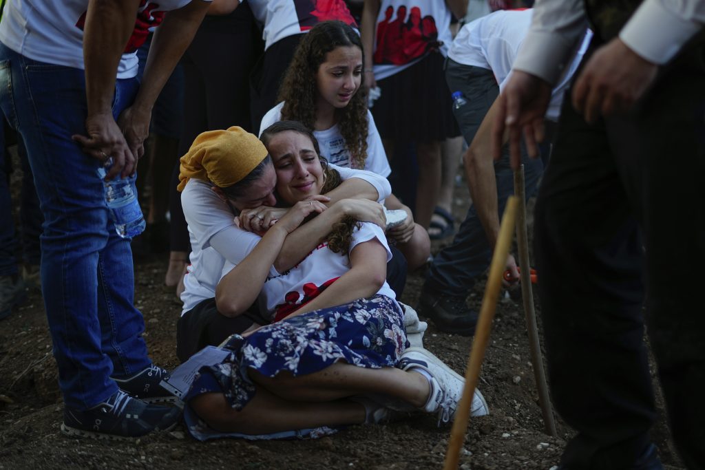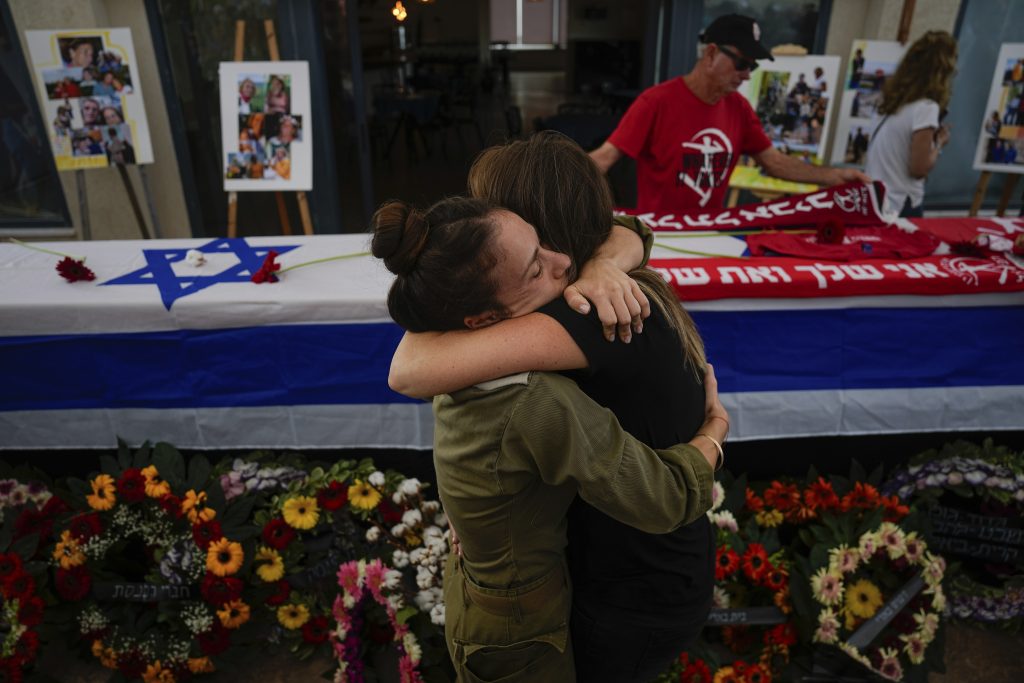 Mourners embrace during the funeral of Meni and Ayelet Godard, in Kibbutz Palmachim, Israel, Sunday, Oct. 29, 2023. The Israeli couple were killed by Hamas militants on Oct. 7 in kibbutz Be'eri near the border with the Gaza Strip. More than 1,400 people were killed and some 220 captured in an unprecedented, multi-front attack on Israel by the militant group that rules Gaza.