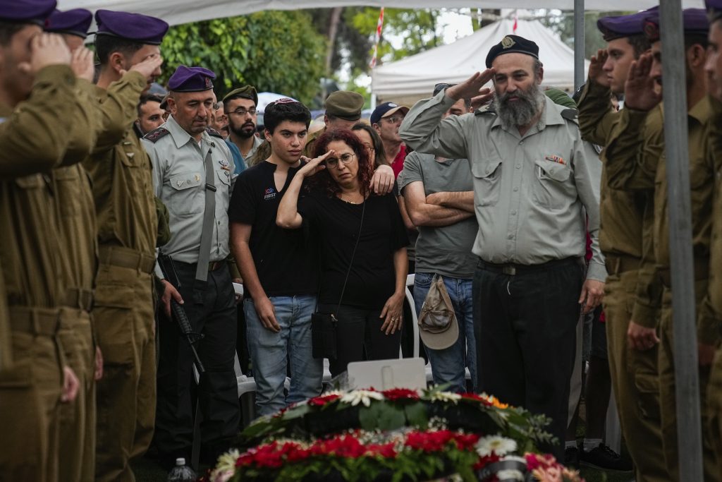 Israeli soldiers and Shlomit Lipshitz, center, mother of Staff Sgt. Lavi Lipshitz salutes over her son's grave during his funeral in the Mount Herzl Military Cemetery in Jerusalem, Wednesday, Nov. 1, 2023. Lipshitz was killed during a ground operation in the Gaza Strip. Israeli ground forces have been operating in Gaza in recent days as Israel presses ahead with its war against Hamas militants.