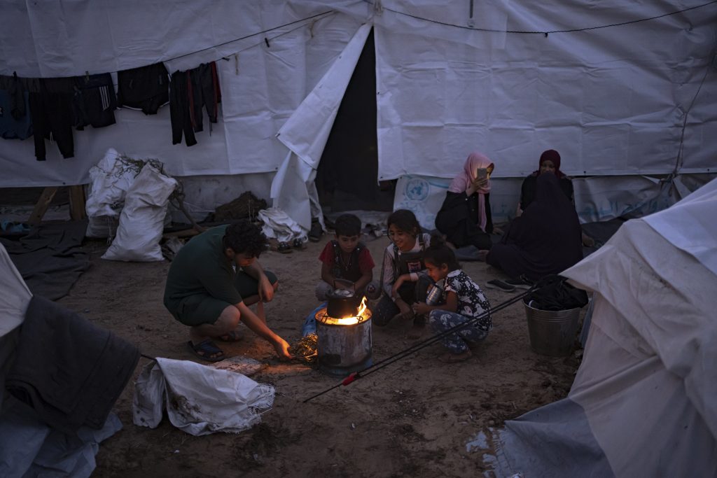 Palestinians displaced by the Israeli bombardment of the Gaza Strip sit by a fire in a UNDP-provided tent camp in Khan Younis, Tuesday, Oct. 31, 2023.