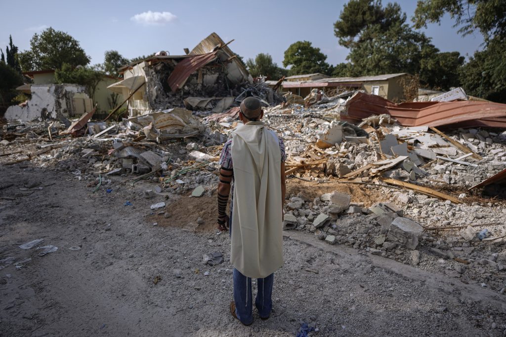 An Israeli man wearing a prayer shawl prays next to houses destroyed by Hamas militants in Kibbutz Be'eri, Israel, Sunday, Oct. 22, 2023. The kibbutz was overrun by Hamas militants from the nearby Gaza Strip on Oct. 7, when they killed and captured many Israelis.