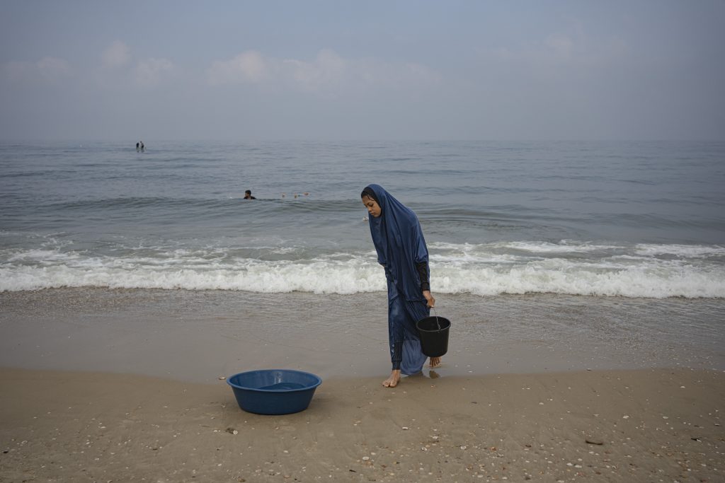 Palestinian woman collects seawater to wash clothes at the beach in Deir al Balah, Gaza Strip, on Thursday, November 2, 2023.