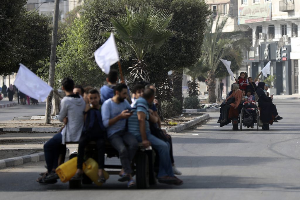 Families walked together, with men and women carrying young children or pushing older people on makeshift carts. Most had only a few belongings in backpacks. A few families rode on donkey carts, holding white flags as they approached Israeli tanks.