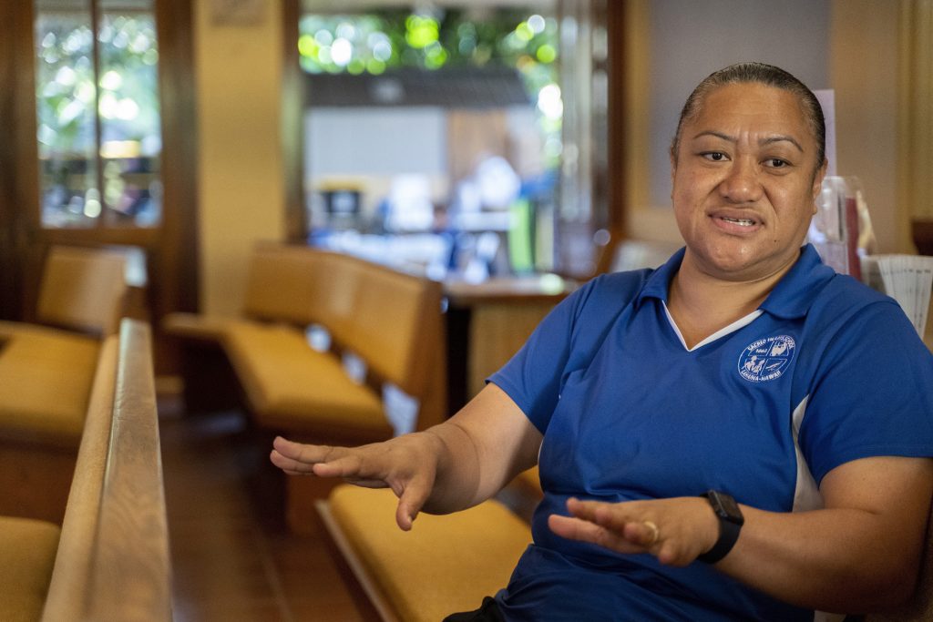 Sacred Hearts School Principal Tonata Lolesio is pictured during an interview at their temporary school site at Sacred Hearts Mission Church on Tuesday, Oct. 3, 2023, in Lahaina, Hawaii. Sacred Hearts School, a Catholic school, was founded in 1862. Most of the school burned down, but its leaders quickly got classes up and running at Sacred Hearts Mission Church 10 miles (16 kilometers) away.