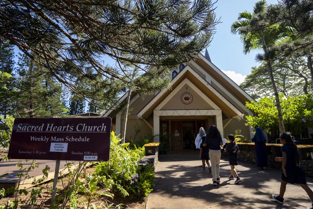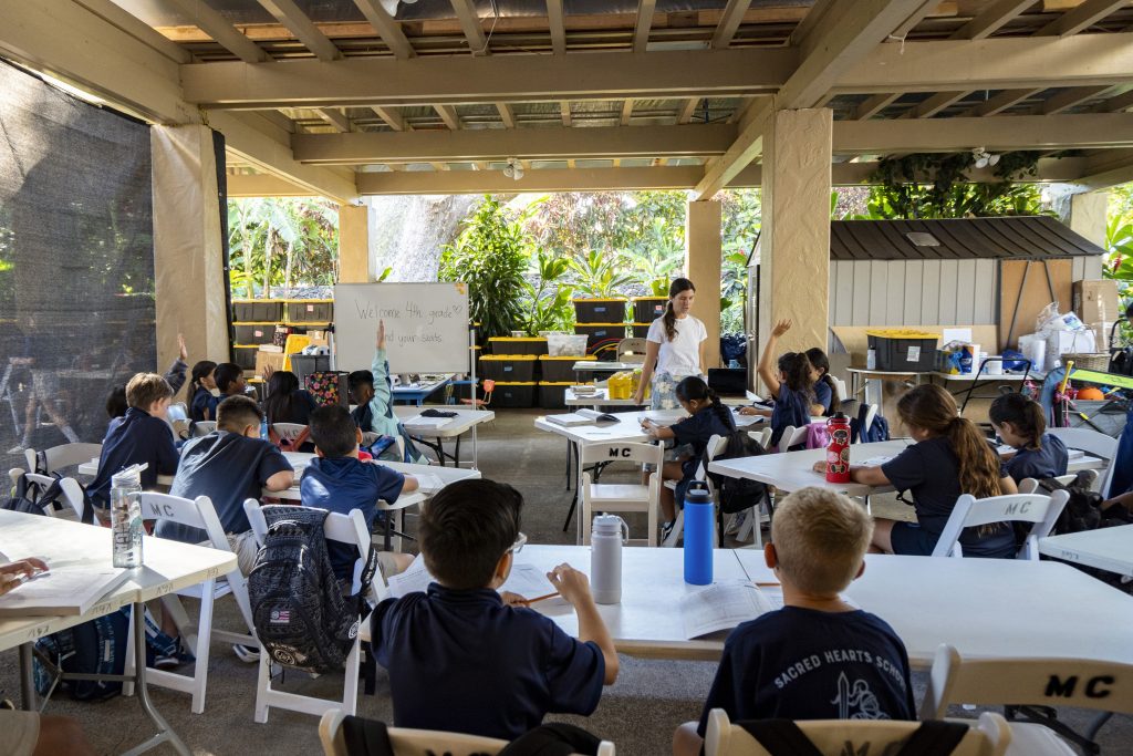 On a recent school day at Sacred Hearts’ temporary site, teachers moved students between pockets of shade to keep them out of the relentless Lahaina sun. Principal Tonata Lolesio told students assembled on cushioned pews in a chapel that it might be two years before they can return to a rebuilt school.
