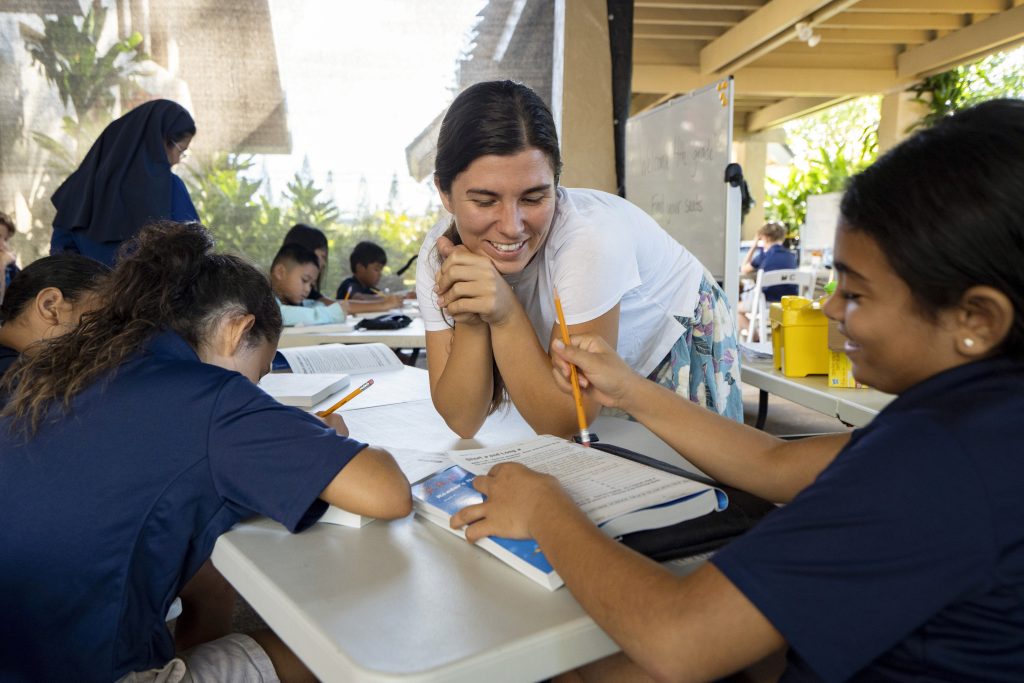 Sacred Hearts School second grade teacher Courtney Copriviza interacts with the fourth graders at their temporary school site at Sacred Hearts Mission Church on Tuesday, Oct. 3, 2023, in Lahaina, Hawaii. Sacred Hearts and other private schools across the state took in displaced public school students, and offered a year of free tuition.