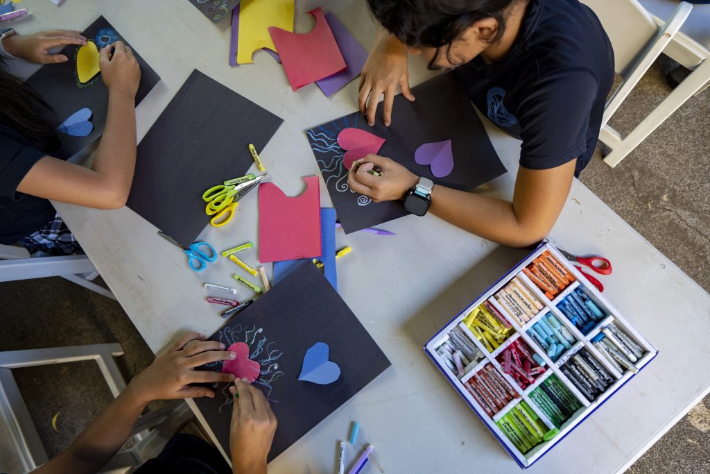 Sacred Hearts School fifth grade students draw around hearts at their temporary school site at Sacred Hearts Mission Church on Tuesday, Oct. 3, 2023, in Lahaina, Hawaii. Sacred Hearts and other private schools across the state took in displaced public school students. The three public schools that survived the deadly August wildfire are set to reopen this week