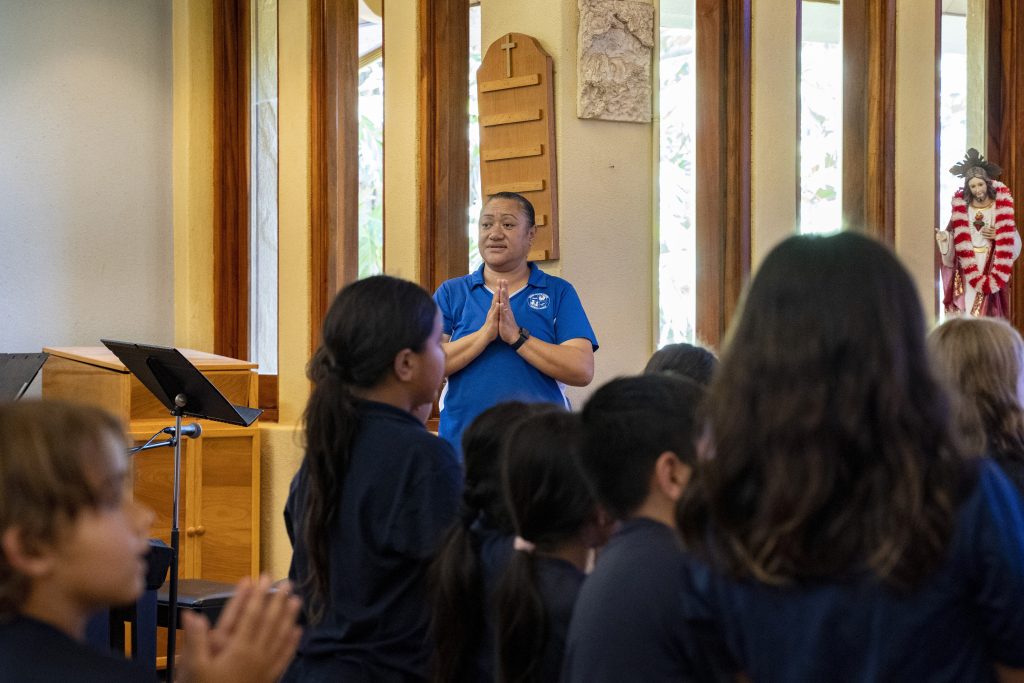 Sacred Hearts School Principal Tonata Lolesio leads a prayer during an assembly at Sacred Hearts Mission Church on Tuesday, Oct. 3, 2023, in Lahaina, Hawaii. Sacred Hearts School, a Catholic school, was founded in 1862. Most of the school burned down, but its leaders quickly got classes up and running at Sacred Hearts Mission Church 10 miles (16 kilometers) away.