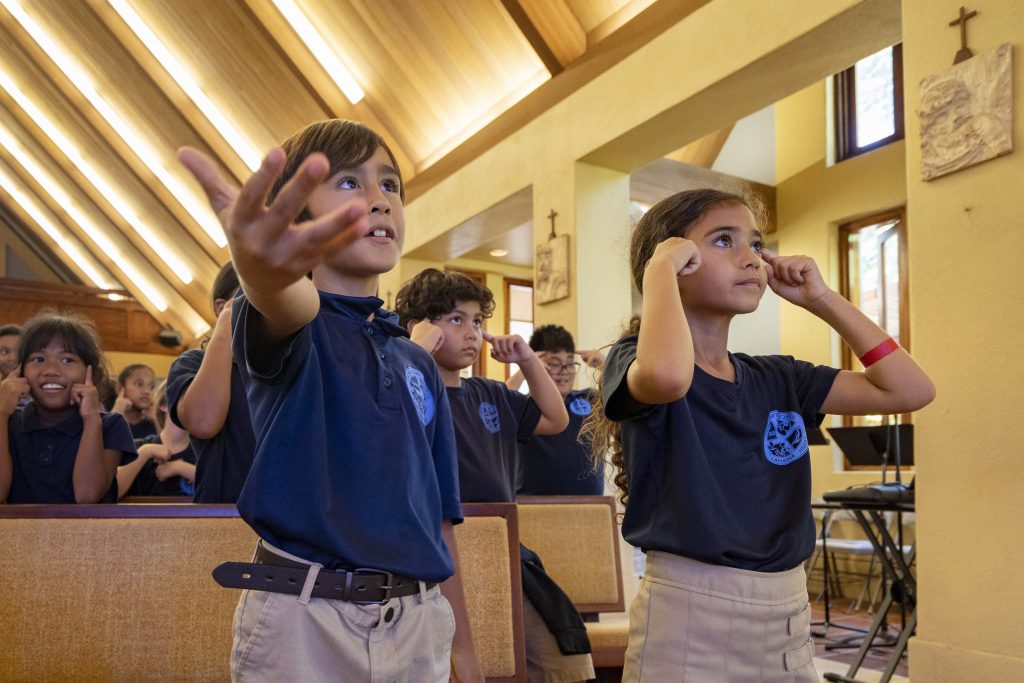 Sacred Hearts School students sing and dance to "Lean on Me" during an assembly at Sacred Hearts Mission Church on Tuesday, Oct. 3, 2023, in Lahaina, Hawaii. Sacred Hearts School, a Catholic school, was founded in 1862. Most of the school burned down, but its leaders quickly got classes up and running at Sacred Hearts Mission Church 10 miles (16 kilometers) away.