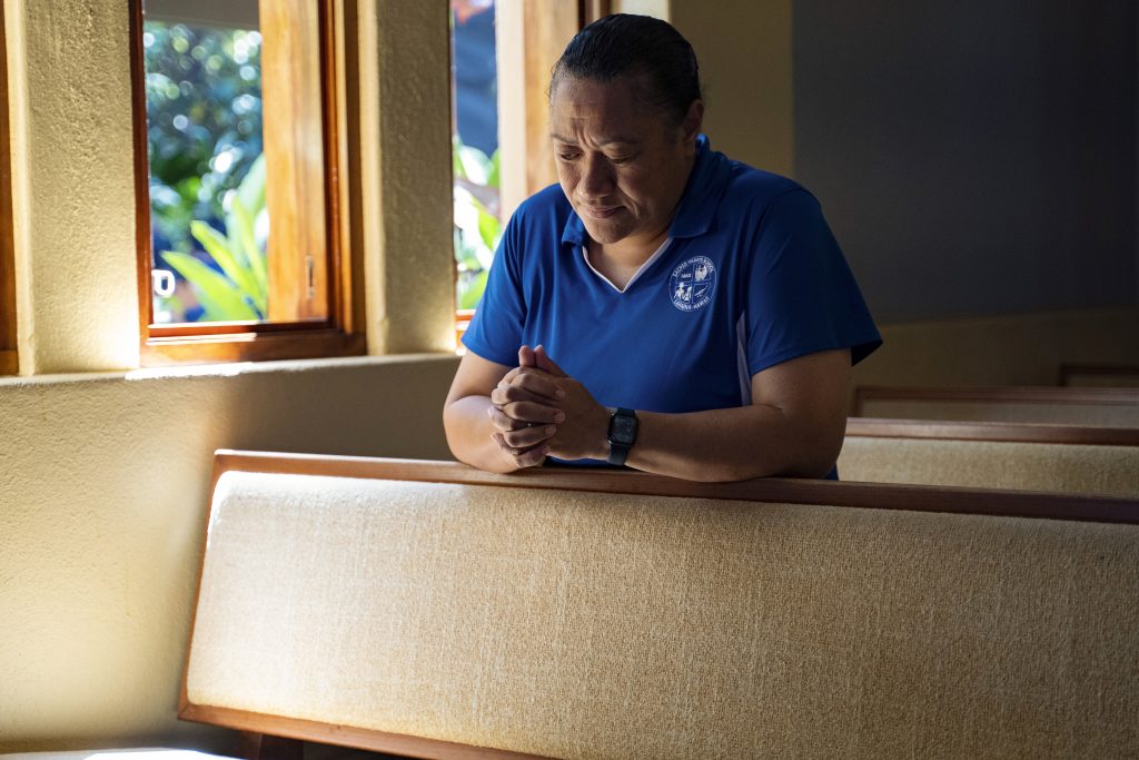 Sacred Hearts School Principal Tonata Lolesio prays after a school day at their temporary location at Sacred Hearts Mission Church on Tuesday, Oct. 3, 2023, in Lahaina, Hawaii. Sacred Hearts School, a Catholic school was founded in 1862. Most of the school burned down, but its leaders quickly got classes up and running at Sacred Hearts Mission Church 10 miles (16 kilometers) away.