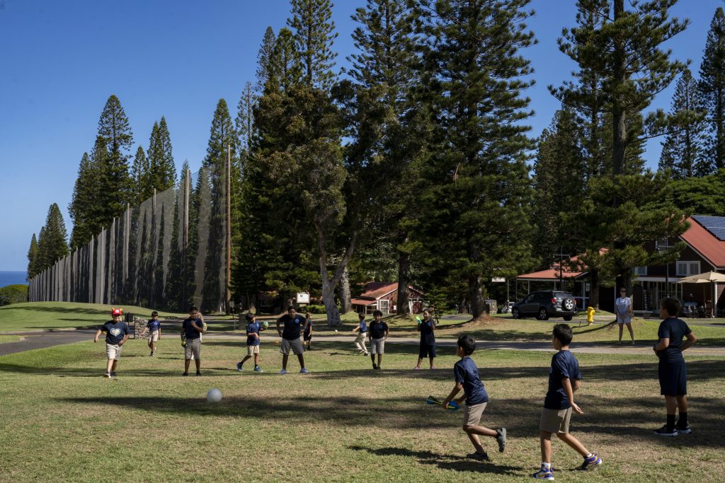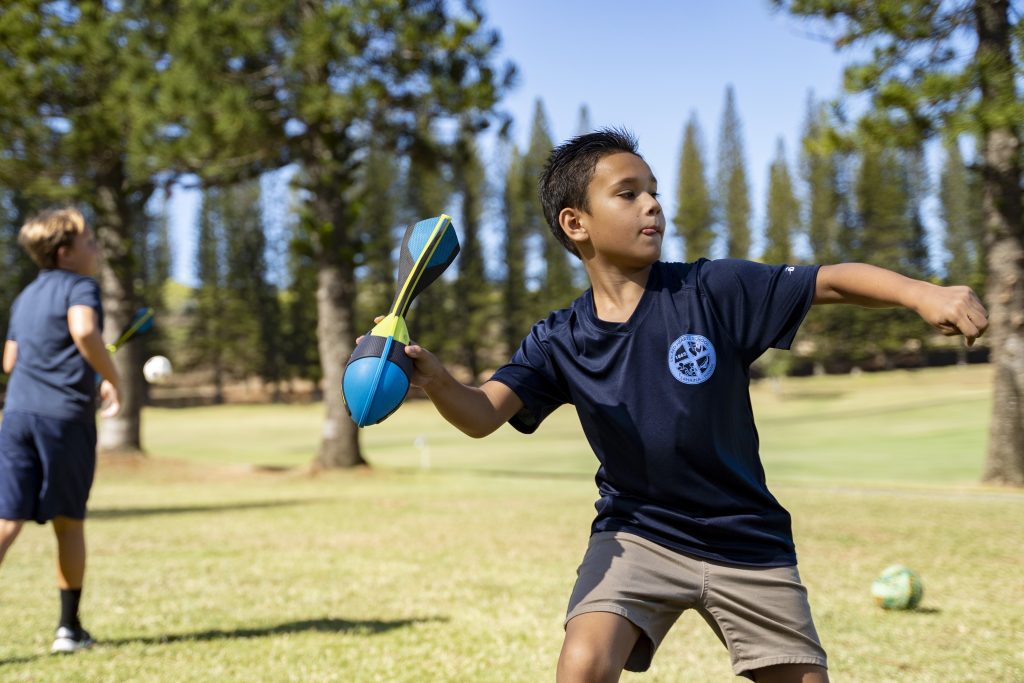 Sacred Hearts School third grade student Kupa'a Williams throws a ball during recess at a golf course at Kapalua Resort on Tuesday, Oct. 3, 2023, in Lahaina, Hawaii. The three public schools that survived the deadly August wildfire are set to reopen this week.