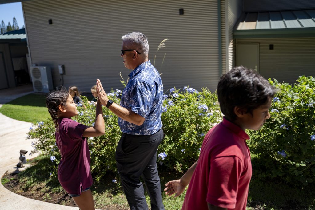Maui Preparatory Academy head Dr. Miguel Solis high-fives a student on Tuesday, Oct. 3, 2023, in Lahaina, Hawaii. At one point the academy had taken in about 150 public school students. The three public schools that survived the deadly August wildfire are set to reopen this week.